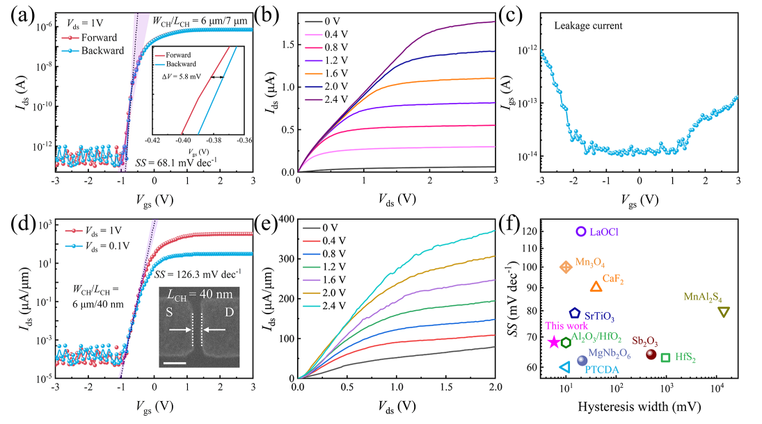 Figure 5. Electrical performance of a MoS2 FET with β-Ga2O3 as a top-gate dielectric fabricated under glovebox with oxygen-free environment. (a) Transfer characteristics (Ids−Vgs) at Vds = 1 V, showing an on/off ratio >106 , SS of 68.1 mV/dec, and hysteresis of 5.8 mV (inset: magnified view). Inset: Optical microscopy image of the device structure. Scale bars: 10 μm. The solid black line represents the fitting curve, and the purple layer is the 95% confidence interval. (b) Output curves (Ids−Vds) at stepped Vgs values (0−2.4 V), demonstrating current saturation and gate tunability. (c) Gate leakage current (Ig−Vgs) below 10−13 A, highlighting the dielectric’s insulating quality. (d, e) The transfer curves (d) and output curves (e) of a 40 nm-channel β-Ga2O3/MoS2 FET. Inset: SEM image of the 40 nm-channel in β-Ga2O3/MoS2 FET. Scale bars: 100 nm. (f) Benchmark of SS and hysteresis against reported dielectrics highlighting the promising performance of β-Ga2O3.