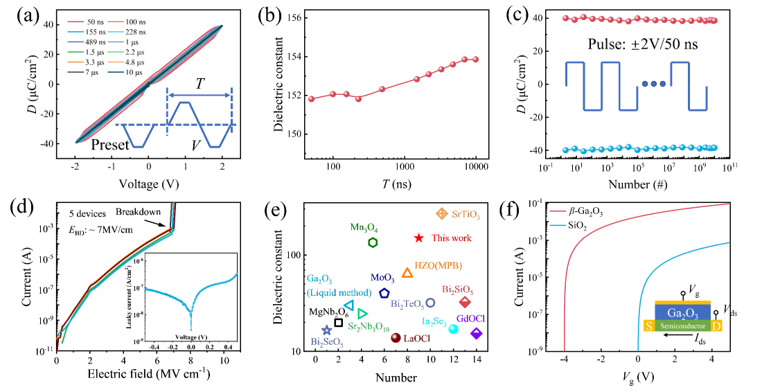 Figure 4. Comprehensive electrical characterization and high-k performance of the β-Ga2O3-based capacitor. (a) Electric displacement-field (D-E) hysteresis loops measured at frequencies from 20 MHz to 100 kHz. Inset shows the pulse scheme of the D-E test. (b) The parenthetic values of ε′ are estimated from the slopes of the loops in (a). (c) Cycling number dependences of the stored charge density within the β-Ga2O3 capacitor under application of unipolar square pulses with voltage/width characteristics of 2 V/50 ns with a repetition frequency of 10 MHz at room temperature. Inset shows the pulse scheme of the endurance test. (d) Current as a function of the applied electric field during quasi-static I−V measurements for five independent devices, with arrows highlighting the breakdown points where catastrophic failure occurs. Inset: Leakage current density versus applied electric voltages (J−V characteristic). (e) Comparison of the dielectric constant achieved in this work with previously reported values for various dielectric materials. (f) Simulated drain current versus gate voltage (Id−Vg) transfer characteristics of a MOSFET utilizing the high-k β-Ga2O3 as the top-gate dielectric.