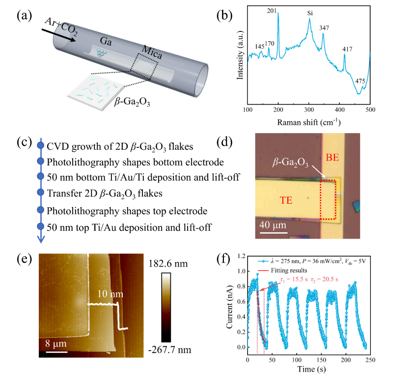Figure 1. Fabrication, characterization, and electrical performance of the β-Ga2O3 MIM capacitor. (a) Synthesis schematic illustration of β-Ga2O3 flakes grown on mica. (b) Raman spectra of β-Ga2O3 flakes on Si/SiO2 substrate. (c) Schematic illustration of the key fabrication steps for the MIM capacitor based on a β-Ga2O3 dielectric layer. (d) Top-view optical microscopy image of the completed capacitor device. (e) AFM image illustrating the surface morphology. (f) I−t characteristics of the β-Ga2O3 capacitor measured under dark and illuminated conditions.