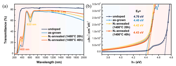 Fig. 6. (a) Transmission spectra and (b) optical band gaps of the undoped, as-grown, and N2-annealed V-doped β-Ga2O3 crystals.