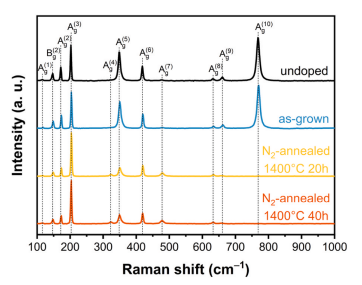 Fig. 7. Raman spectra of the undoped, as-grown, and N2-annealed V-doped β-Ga2O3 crystals.