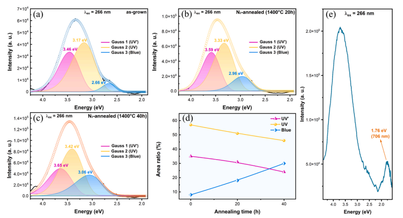 Fig. 8. RT-PL spectra of V-doped β-Ga2O3 single crystals: (a) as-grown, (b) N2-annealed (20 h), (c) N2-annealed (40 h), and N2-annealed (over 40 h). (d) Relationship between annealing time and the proportion of each luminescence peak area in V-doped β-Ga2O3 samples.