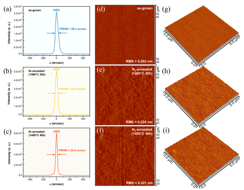 Fig. 3. (a-c) Rocking curves, (d-f) 2D and (g-i) 3D AFM images of as-grown and N2-annealed V-doped β-Ga2O3 crystals.