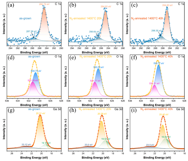 Fig. 5. (a-c) C 1 s, (d-f) O 1 s, (g-i) Ga 3d XPS core level of as-grown and N2-annealed V-doped β-Ga2O3 single crystals.