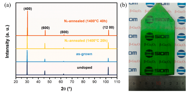 Fig. 2. (a) High-resolution XRD patterns of undoped and V-doped β-Ga2O3 crystals. (b) Photograph of 2-inch V-doped β-Ga2O3 crystal.