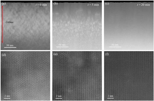 FIG. 6. Cross-sectional STEM images for samples implanted to 1 × 1020 shown as-implanted [(a) and (d)], after annealing for 5 min resulting in optimized electrical activation [(b) and (e)], and after annealing for 20 min [(c) and (f)]. All samples are viewed along the [001] zone axis of β-Ga2O3. Images (a) and (b) show contrast associated with strain in the damaged regions of the implant, with (c) showing complete recovery. Images (d)–(f) are taken from the regions of highest damage.