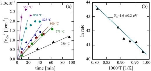 FIG. 4. (a) Plot of compensating acceptors formed as a function of anneal time and temperature for in situ doped samples (8 × 1019 cm−3), presented as the effective concentration of VGa3−, and (b) Arrhenius plot of the initial linear rate of [VGa3−] formation with time indicating an effective activation energy of 1.6 ± 0.2 eV.