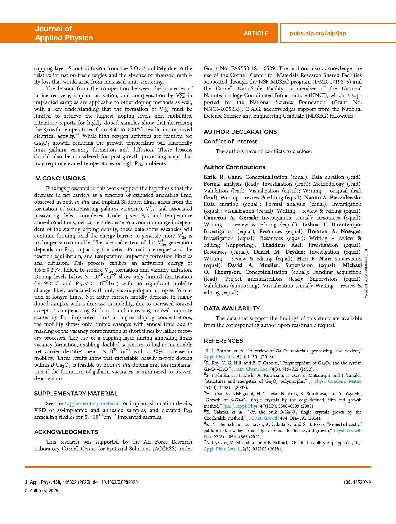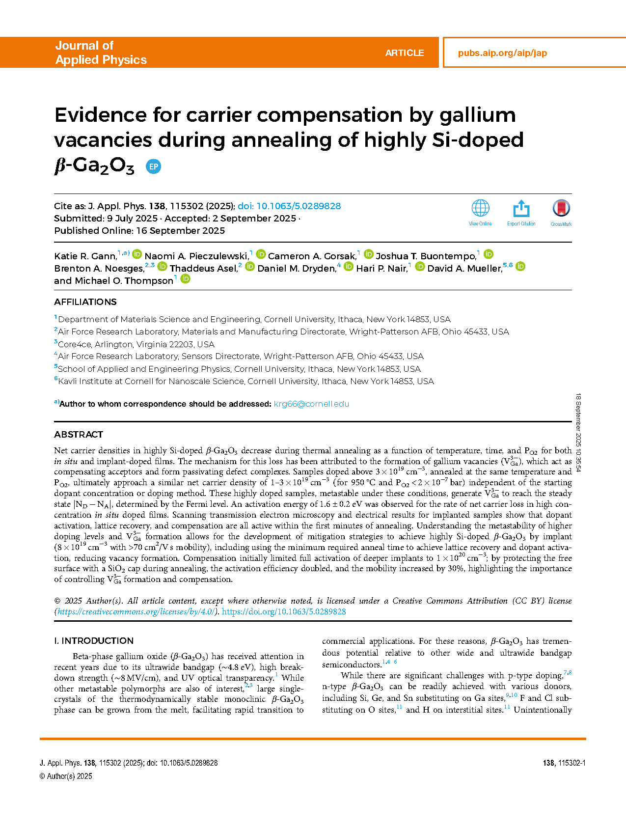 Researchers from the Cornell University have published a dissertation titled " Evidence for carrier compensation by gallium vacancies during annealing of highly Si-doped β-Ga2O3" in Journal of Applied Physics.