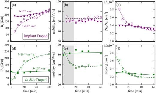 FIG. 5. Plots of Rs [(a) and (d)], mobility [(b) and (e)], and estimated |ND − NA| [(c) and (f)] as a function of anneal time for implant-doped samples [purple circles, (a)–(c)] and in situ doped samples [green squares, (d)–(f)]. Both mid (solid line and solid markers) doping densities and high (dashed line and open markers) doping densities are plotted for both doping methods, with lines drawn as guides to the eye. The region shaded in gray of (b) and (e) highlights the main difference between trends for the two samples.