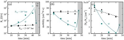 FIG. 2. Hall results of Rs (a), mobility (b), and |ND − NA| (c) for 5 × 1019 cm−3 implanted samples annealed at PO2 < 2 × 10−7 bar (black triangles) and PO2 = 10−4 bar (blue squares). Each anneal condition was tested with two samples to check repeatability, indicated with filled and open symbols of the same shape and color. High PO2 samples (blue) were electrically recovered with a 5-min anneal under the low PO2 conditions, as shown in the shaded gray area and marked with blue arrows. Lines are drawn as a guide to the eye.