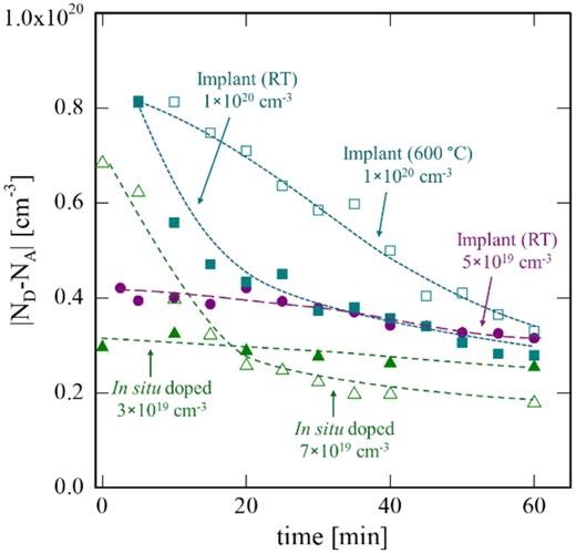 FIG. 1. |ND − NA| as a function of the total anneal time (at 950 °C with PO2 < 2 × 10−7 bar) for samples doped by ion implantation to 5 × 1019 cm−3 (purple dots) and 1 × 1020 cm−3 (blue squares), and for samples doped in situ during growth to a range of 3–7 × 1019 cm−3 (green triangles). Lines are drawn as a guide to the eye.
