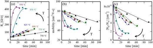 FIG. 3. Hall measurements for staged-time annealing of in situ 8 × 1019 cm−3 doped samples as a function of temperature, indicated with black arrows. Data show trends in (a) Rs, (b) mobility, and (c) carrier density as a function of the total anneal time. Lines are drawn as a guide to the eye for each temperature.
