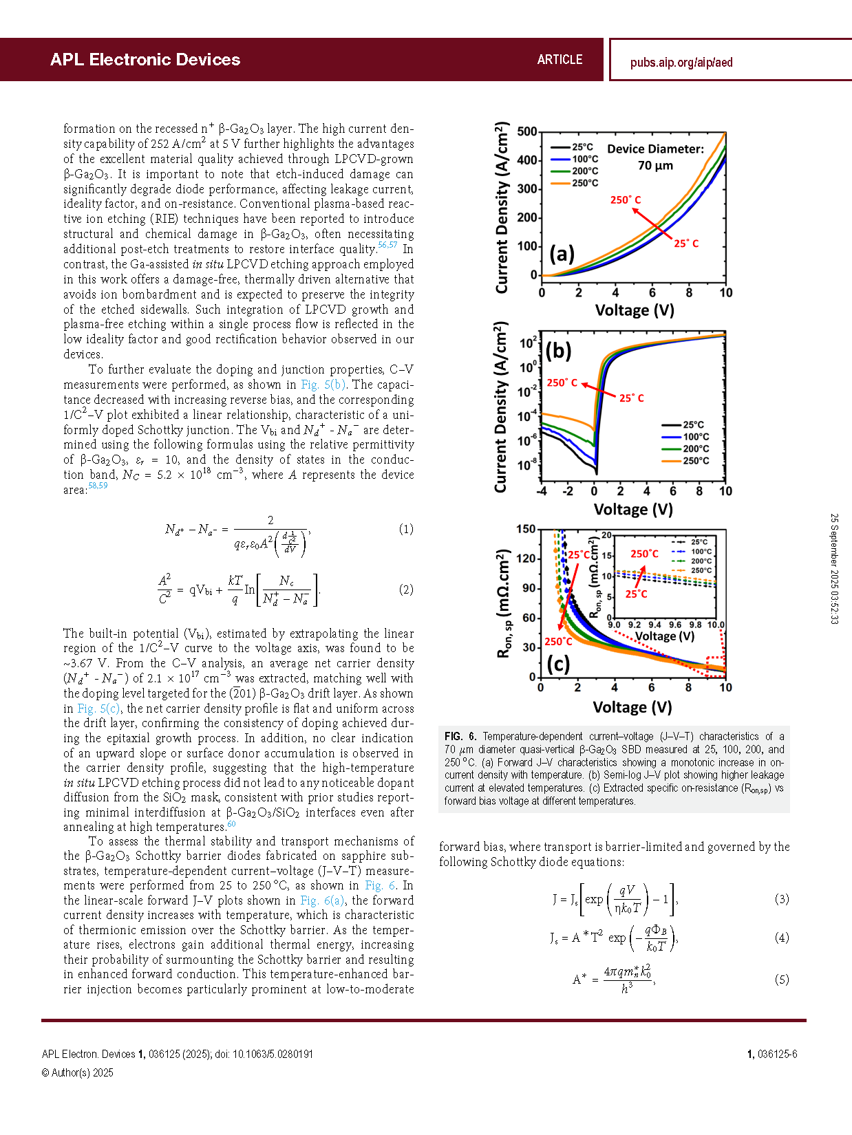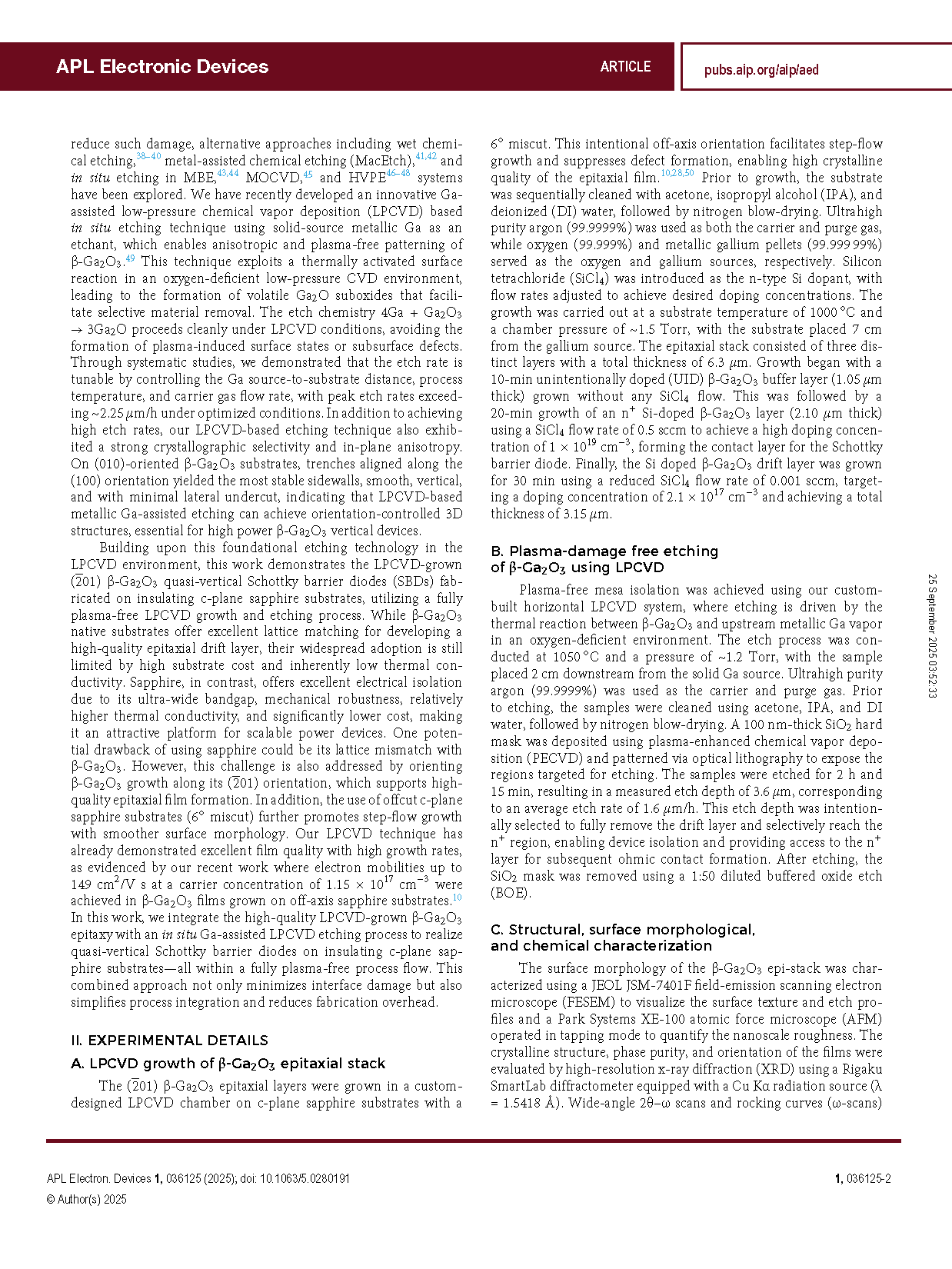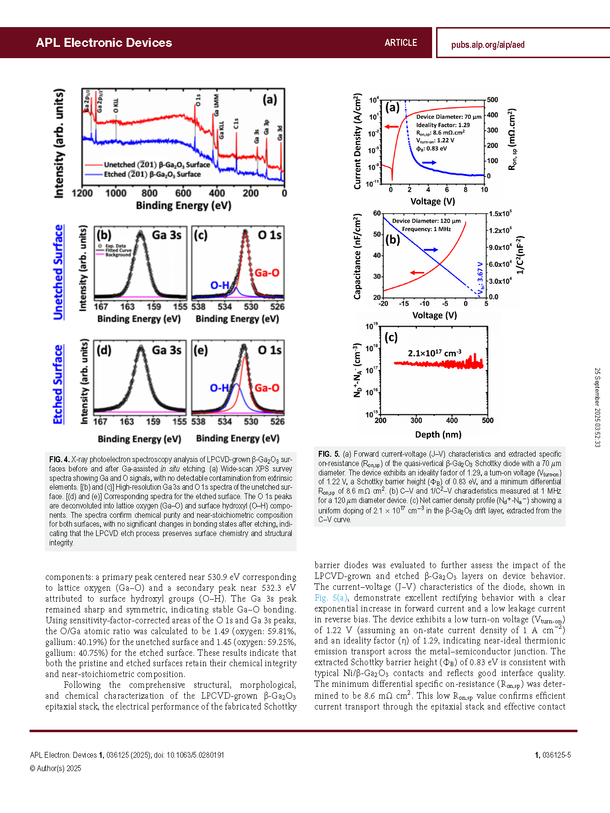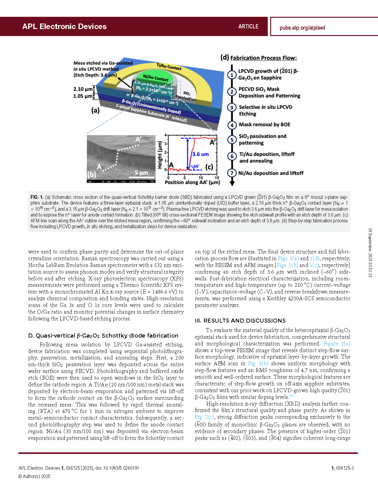Researchers from the University of Massachusetts Lowell have published a dissertation titled "Quasi-vertical β-Ga2O3 Schottky diodes on sapphire using all-LPCVD growth and plasma-free Ga-assisted etching" in APL Electronic Devices.