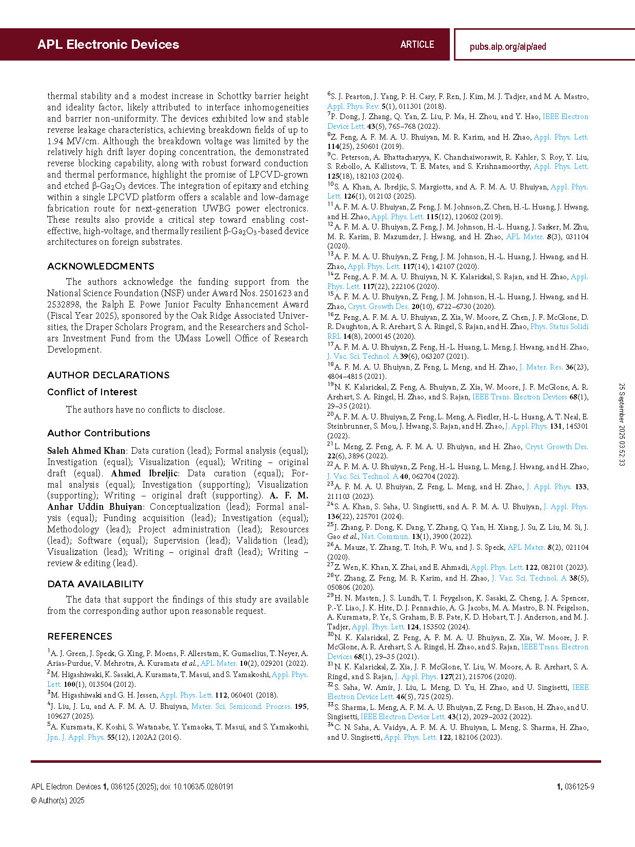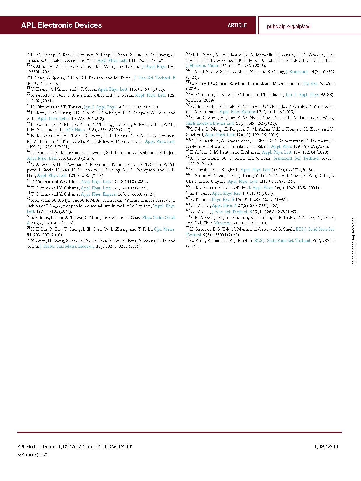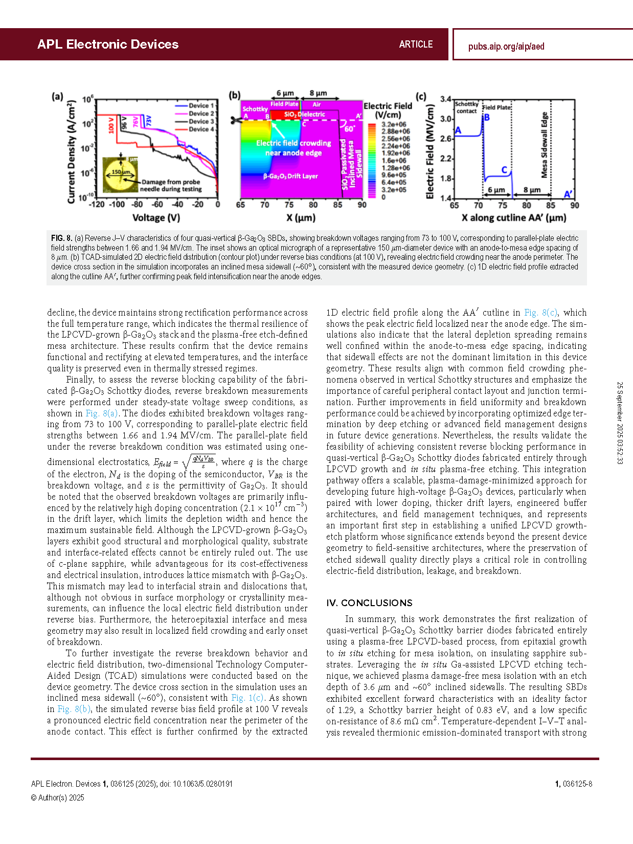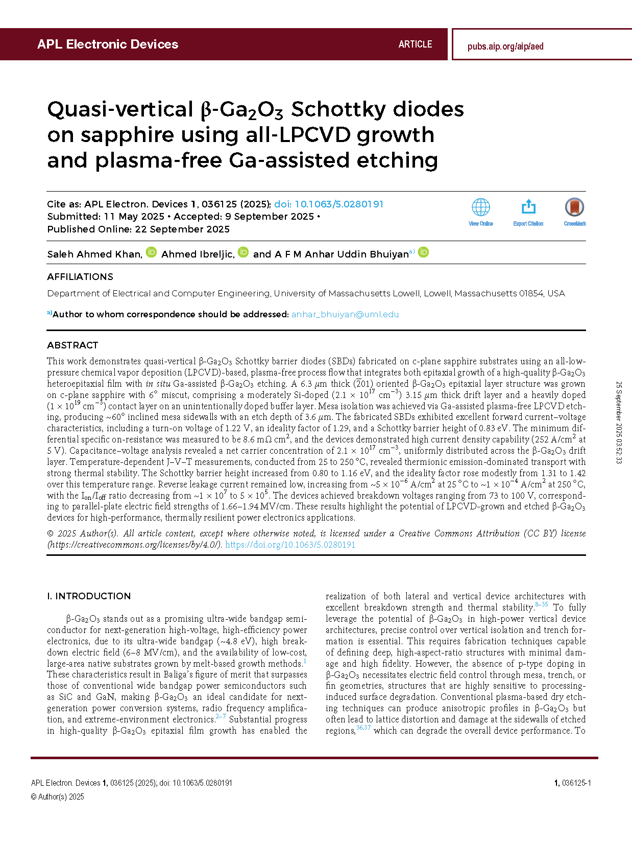 Researchers from the University of Massachusetts Lowell have published a dissertation titled "Quasi-vertical β-Ga2O3 Schottky diodes on sapphire using all-LPCVD growth and plasma-free Ga-assisted etching" in APL Electronic Devices.