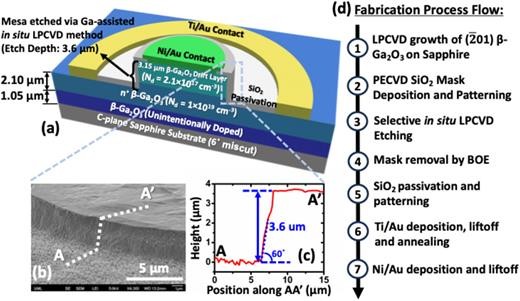 FIG. 1. (a) Schematic cross section of the quasi-vertical Schottky barrier diode (SBD) fabricated using a LPCVD grown (-201) β-Ga2O3 film on a 6° miscut c-plane sapphire substrate. The device features a three-layer epitaxial stack: a 1.05 μm unintentionally doped (UID) buffer layer, a 2.10 μm thick n+ β-Ga2O3 contact layer (Nd = 1 × 1019 cm−3), and a 3.15 μm β-Ga2O3 drift layer (Nd = 2.1 × 1017 cm−3). Plasma-free LPCVD etching was used to etch 3.6 μm into the β-Ga2O3 drift layer for mesa isolation and to expose the n+ layer for anode contact formation. (b) Tilted (60° tilt) cross-sectional FESEM image showing the etch sidewall profile with an etch depth of 3.6 μm. (c) AFM line scan along the AA′ cutline over the etched mesa region, confirming the ∼60° sidewall inclination and an etch depth of 3.6 μm. (d) Step-by-step fabrication process flow including LPCVD growth, in situ etching, and metallization steps for device realization.