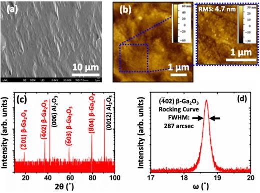 FIG. 2. Structural and surface morphological characterization of the LPCVD-grown heteroepitaxial (-201) β-Ga2O3 epitaxial stack used in device fabrication. (a) Top-view FESEM image showing clear step-flow surface morphology, indicative of high crystalline quality and epitaxial layer-by-layer growth. (b) AFM scan of the film surface reveals smooth morphology with a root mean square (RMS) roughness of 4.7 nm. (c) XRD ω–2θ scan showing strong diffraction peaks corresponding to the (-h0l) family of (-201) β-Ga2O3, along with sapphire substrate peaks, confirming phase purity and preferred orientation. (d) XRD ω-rocking curve of the (-402) reflection exhibiting a narrow full width at half maximum (FWHM) of 287 arcsec, indicating the high crystalline quality of the β-Ga2O3 epitaxial stack.