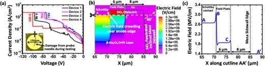 FIG. 8. (a) Reverse J–V characteristics of four quasi-vertical β-Ga2O3 SBDs, showing breakdown voltages ranging from 73 to 100 V, corresponding to parallel-plate electric field strengths between 1.66 and 1.94 MV/cm. The inset shows an optical micrograph of a representative 150 μm-diameter device with an anode-to-mesa edge spacing of 8 μm. (b) TCAD-simulated 2D electric field distribution (contour plot) under reverse bias conditions (at 100 V), revealing electric field crowding near the anode perimeter. The device cross section in the simulation incorporates an inclined mesa sidewall (∼60°), consistent with the measured device geometry. (c) 1D electric field profile extracted along the cutline AA′, further confirming peak field intensification near the anode edges.