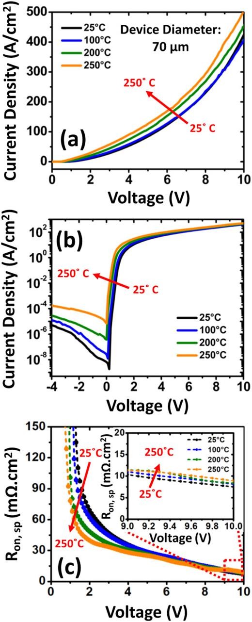FIG. 6. Temperature-dependent current–voltage (J–V–T) characteristics of a 70 μm diameter quasi-vertical β-Ga2O3 SBD measured at 25, 100, 200, and 250 °C. (a) Forward J–V characteristics showing a monotonic increase in on-current density with temperature. (b) Semi-log J–V plot showing higher leakage current at elevated temperatures. (c) Extracted specific on-resistance (Ron,sp) vs forward bias voltage at different temperatures.