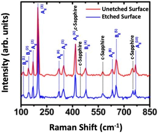 FIG. 3. Room temperature Raman spectra of the LPCVD-grown heteroepitaxial (01) β-Ga2O3 surface before (red) and after (blue) Ga-assisted in situ LPCVD etching. Both spectra exhibit sharp and well-defined Ag and Bg phonon modes characteristic of monoclinic β-Ga2O3, confirming structural integrity and phase purity. Peaks from the c-plane sapphire substrate are also visible in both spectra.