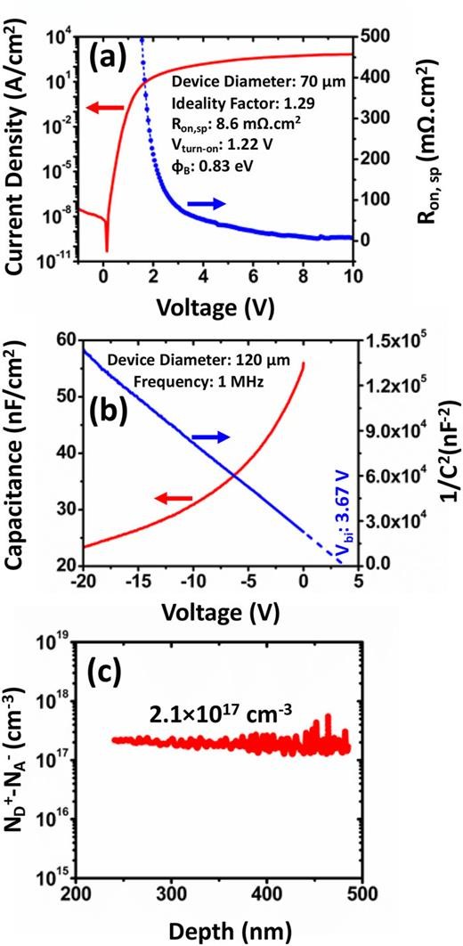 FIG. 5. (a) Forward current-voltage (J–V) characteristics and extracted specific on-resistance (Ron,sp) of the quasi-vertical β-Ga2O3 Schottky diode with a 70 μm diameter. The device exhibits an ideality factor of 1.29, a turn-on voltage (Vturn-on) of 1.22 V, a Schottky barrier height (ΦB) of 0.83 eV, and a minimum differential Ron,sp of 8.6 mΩ cm2. (b) C–V and 1/C2–V characteristics measured at 1 MHz for a 120 μm diameter device. (c) Net carrier density profile (Nd+-Na−) showing a uniform doping of 2.1 × 1017 cm−3 in the β-Ga2O3 drift layer, extracted from the C–V curve.