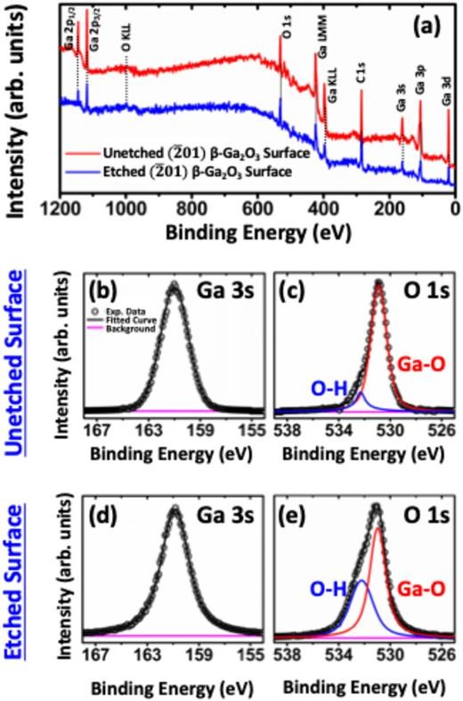 FIG. 4. X-ray photoelectron spectroscopy analysis of LPCVD-grown β-Ga2O3 surfaces before and after Ga-assisted in situ etching. (a) Wide-scan XPS survey spectra showing Ga and O signals, with no detectable contamination from extrinsic elements. [(b) and (c)] High-resolution Ga 3s and O 1s spectra of the unetched surface. [(d) and (e)] Corresponding spectra for the etched surface. The O 1s peaks are deconvoluted into lattice oxygen (Ga–O) and surface hydroxyl (O–H) components. The spectra confirm chemical purity and near-stoichiometric composition for both surfaces, with no significant changes in bonding states after etching, indicating that the LPCVD etch process preserves surface chemistry and structural integrity.
