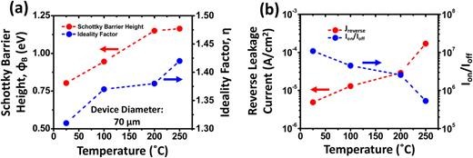 FIG. 7. Temperature-dependent Schottky diode performance metrics. (a) Extracted Schottky barrier height (ΦB) and ideality factor (η) as a function of temperature, showing an increase in ΦB and η with rising temperature. (b) Reverse leakage current (Jreverse) and on/off current ratio (Ion/Ioff) vs temperature, illustrating the thermally activated increase in leakage and corresponding reduction in rectification ratio at elevated temperatures.