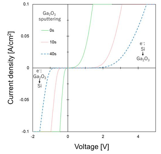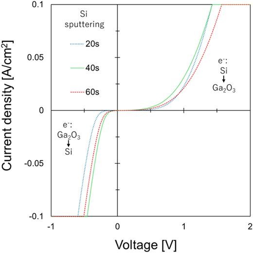 FIG. 3. I–V characteristics of bonded β-Ga2O3/Si specimens under three different sputtering conditions for β-Ga2O3. Electrons moved from Si to β-Ga2O3 at the first quadrant and from β-Ga2O3 to Si at the third quadrant.