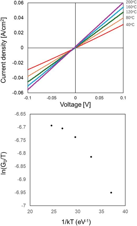 FIG. 9. Temperature dependence of the I–V characteristics of the bonded β-Ga2O3/Si specimen annealed at 800 °C. The ln(G0/T) vs 1/kT plot was not linear, indicating that thermionic emission was not the dominant transport mechanism in this specimen.