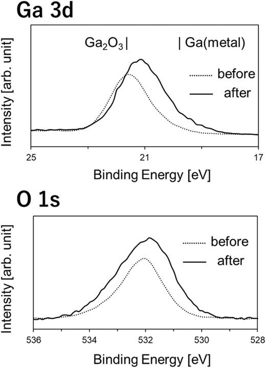 FIG. 4. XPS spectra of Ga 3d and O 1s for the β-Ga2O3 surface before and after 60 s of sputtering. Shift in the Ga 3d peak and variation in the Ga/O peak area ratio suggest chemical modification toward a Ga-rich surface.