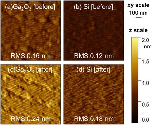 FIG. 5. AFM images of β-Ga2O3 and Si surfaces (a) and (b) before and (c) and (d) after sputtering the Si surface for 40 s. Both surfaces were atomically smooth after sputtering.