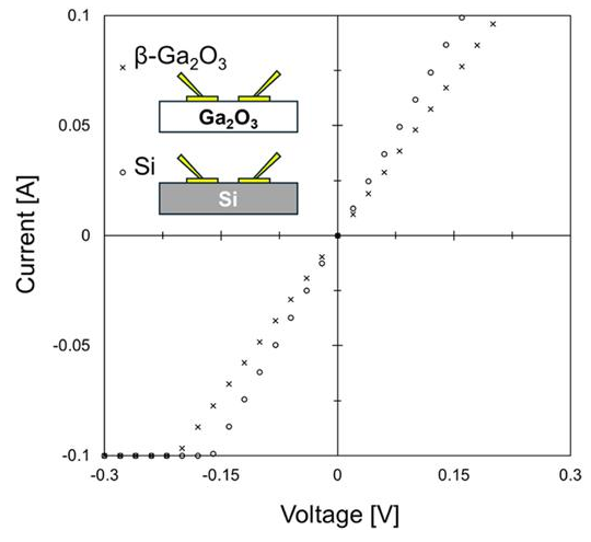 FIG. 2. Current–voltage (I–V) characteristics of Au/Ti contact pads formed on β-Ga2O3 (cross) and Si (circle) surfaces to ensure ohmic contact.