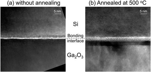FIG. 10. TEM images of the β-Ga2O3/Si interface before and after annealing at 500 °C. Distortion observed in the Si surface lattice was recovered by annealing, resulting in improved electrical conductivity.