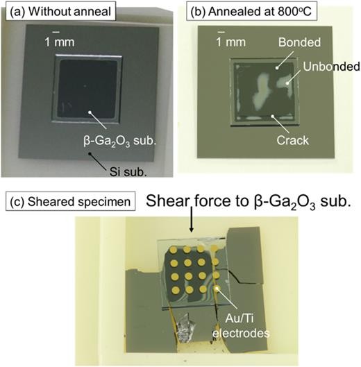 FIG. 6. β-Ga2O3/Si substrates after (a) bonding at room temperature and (b) annealing at 800 °C, which results in unbonded area and cracks. (c) In the shear test, fracture occurred within the Si substrate instead of the bonding interface.