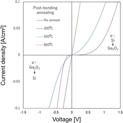 FIG. 8. I–V characteristics of bonded β-Ga2O3/Si specimens under different post-bonding annealing conditions. Annealing over 500 °C enables ohmic-like β-Ga2O3/Si contact.