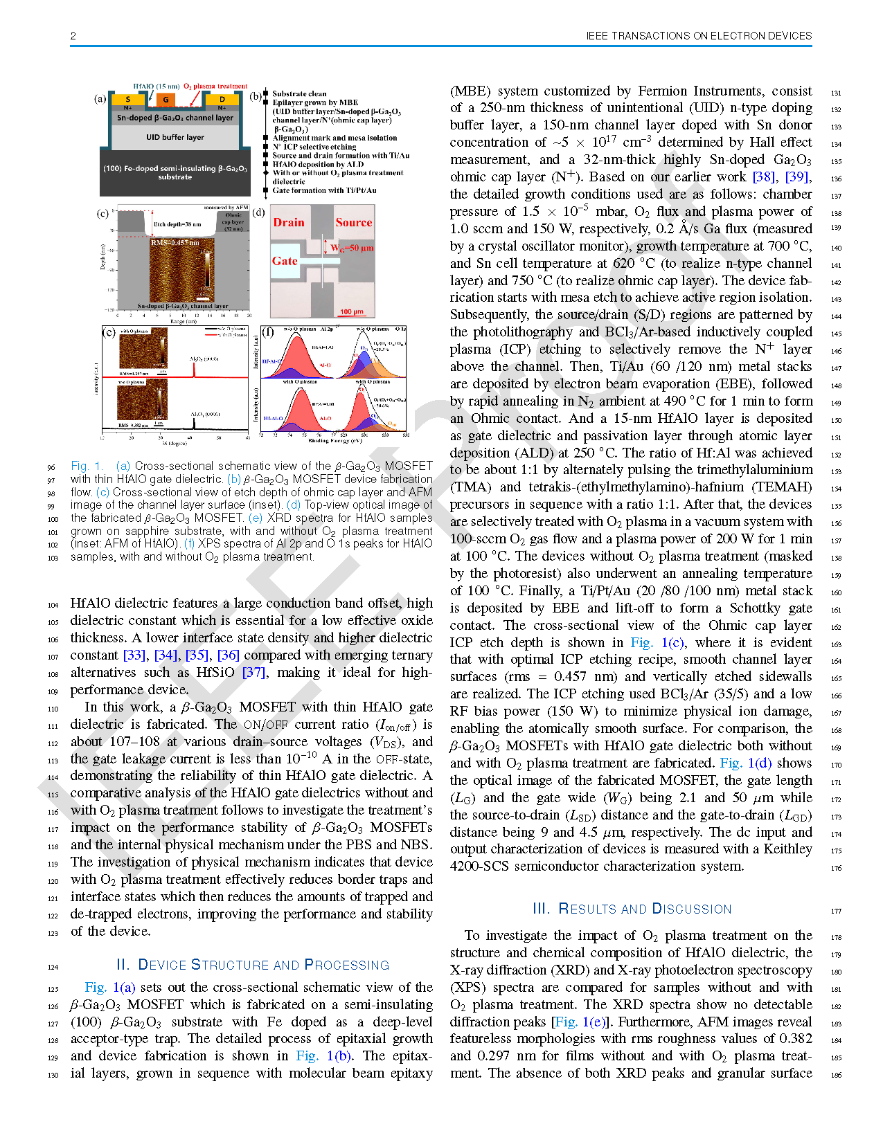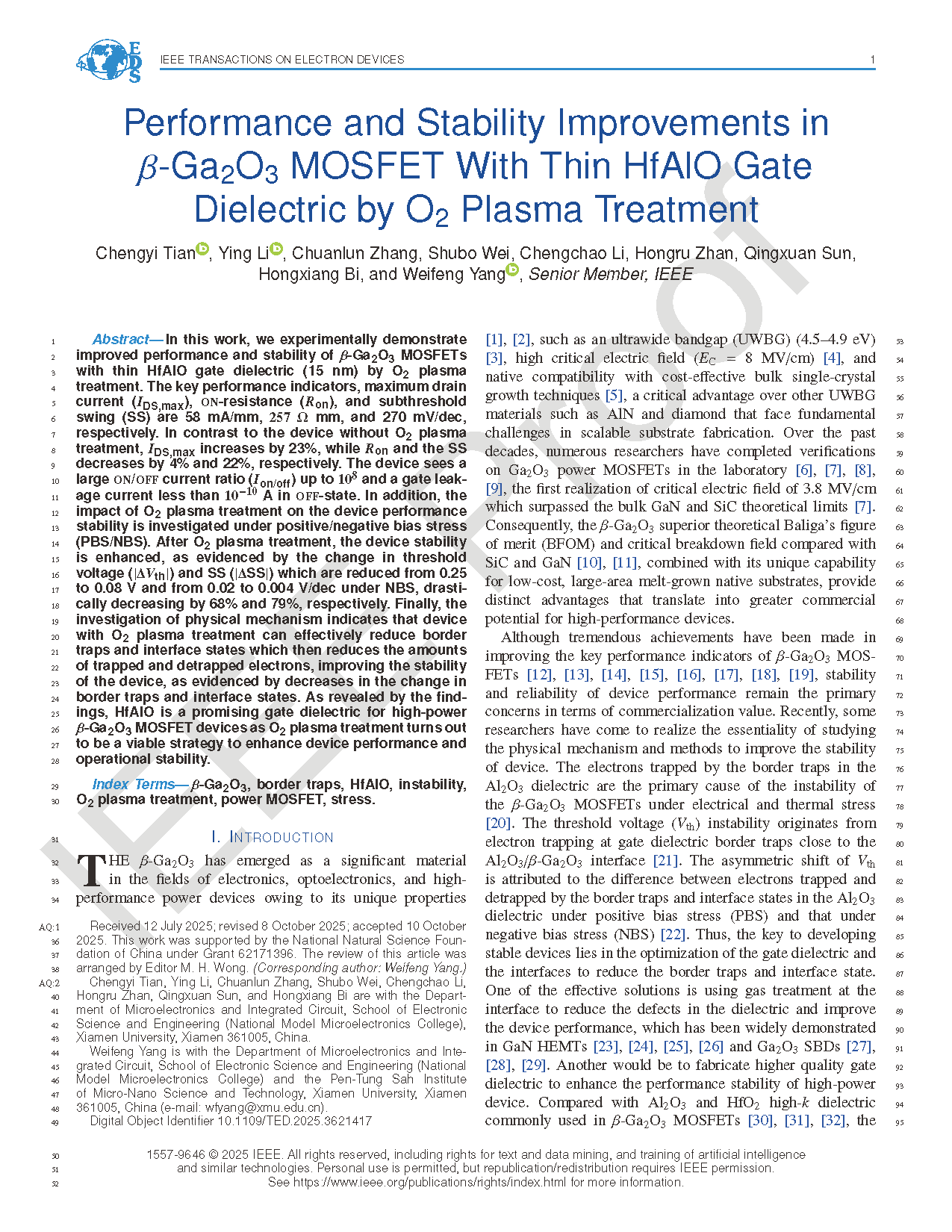 A research team from Xiamen University has published a paper titled "Performance and Stability Improvements in β-Ga2O3 MOSFET With Thin HfAlO Gate Dielectric by O2 Plasma Treatment" in the academic journal IEEE Transactions on Electron Devices.
