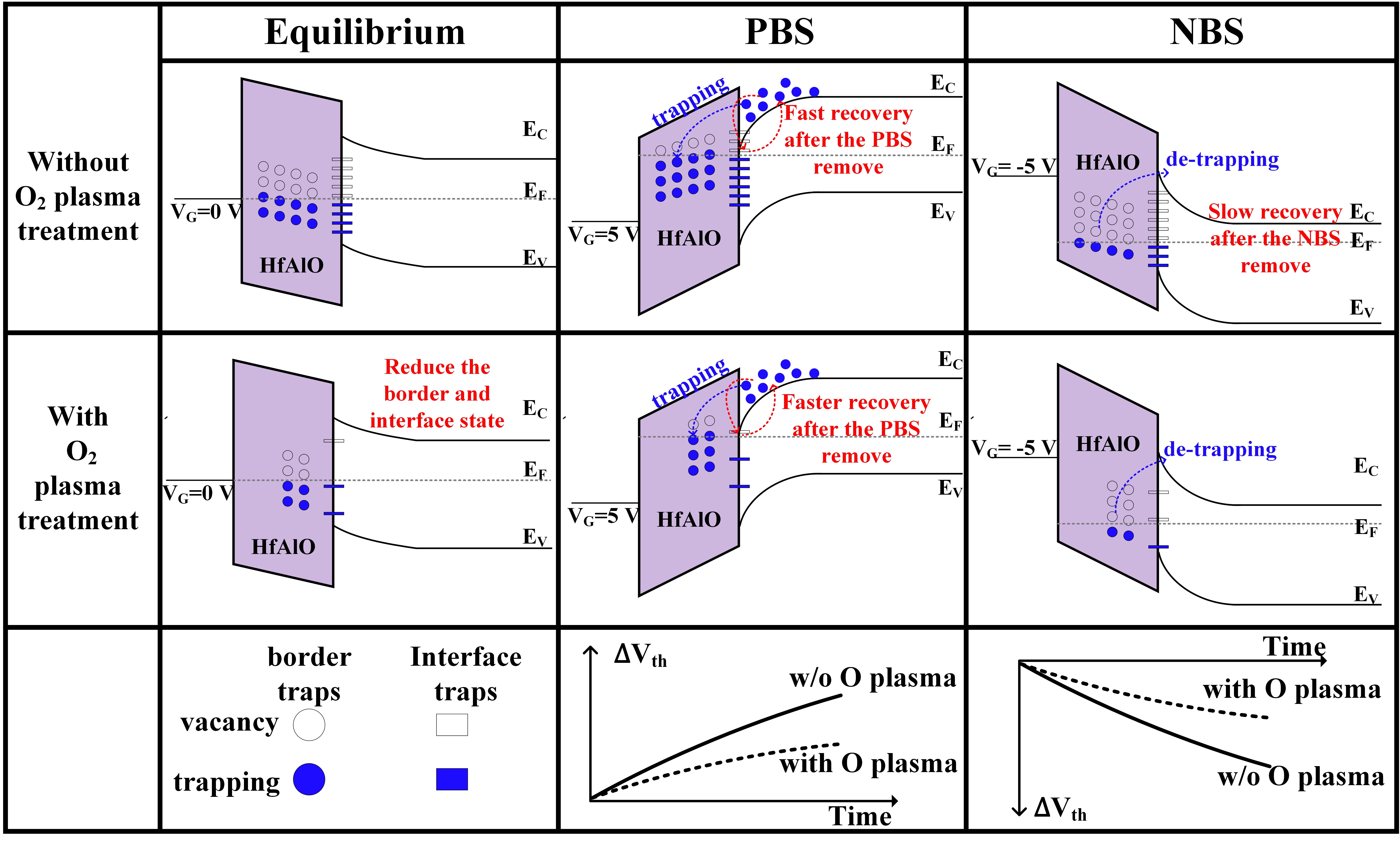 FIG.4. Energy band diagram of the HfAlO gate dielectric β-Ga2O3 MOSFET without and with O2 plasma treatment under equilibrium, PBS and NBS.