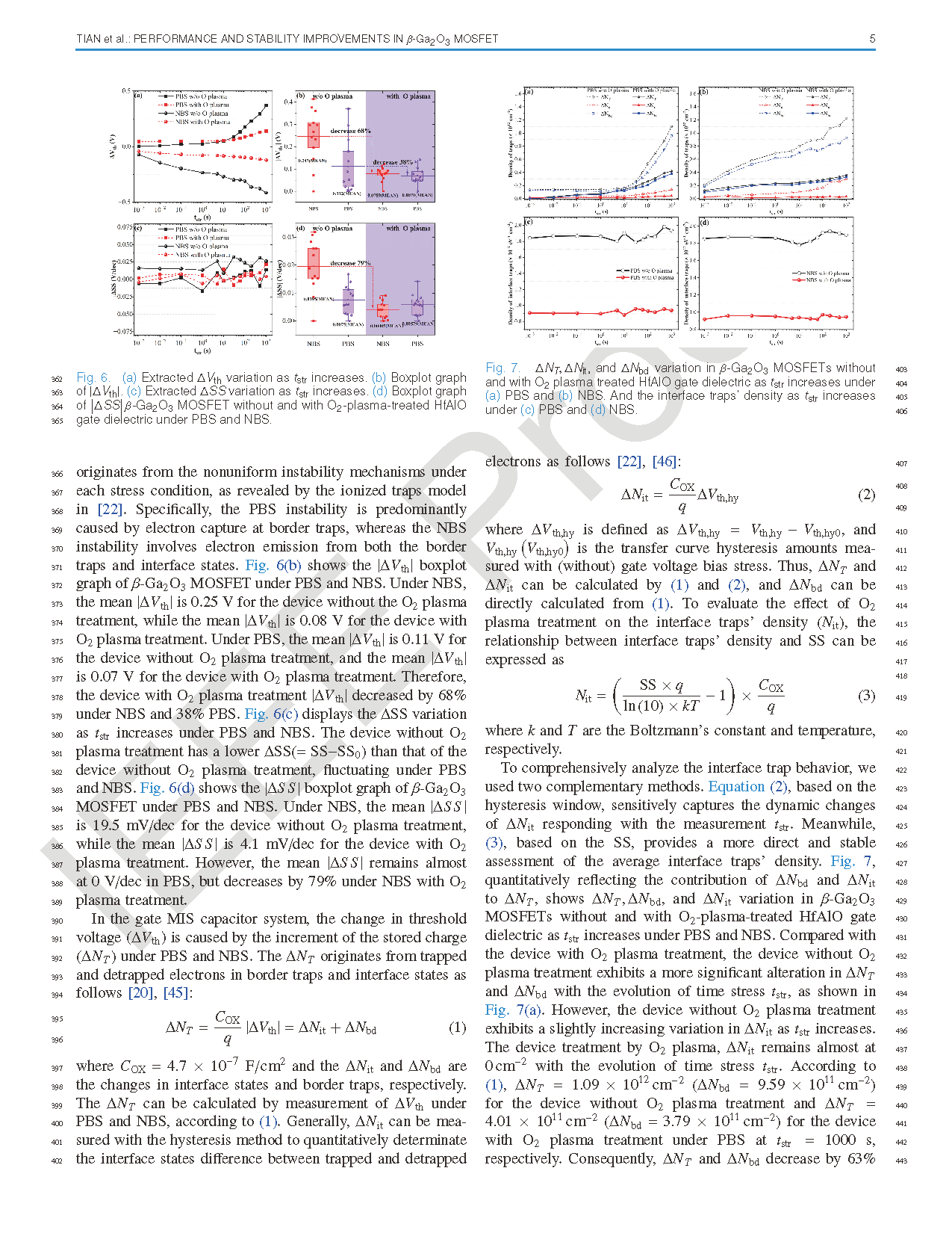 The research team successfully grew high-quality epitaxial layers on a (100) plane β-Ga₂O₃ substrate using molecular beam epitaxy (MBE). Subsequently, an optimized inductively coupled plasma (ICP) etching process was employed to achieve an atomic-level channel surface with a roughness as low as 0.457 nm, laying a solid foundation for high-performance devices. The device utilized a 15 nm HfAlO high-k material as the gate dielectric, achieving excellent gate control capability and low gate leakage current (<10-10 A). Through O2 plasma treatment of the HfAlO gate dielectric, interface and bulk defects were effectively repaired, reducing electron trap centers. After O2 plasma treatment, the maximum drain current (IDS,max) increased by 23%, the subthreshold swing (SS) decreased by 22%, and the on/off current ratio (Ion/off) reached 108. The impact of O2 plasma treatment on device stability was systematically investigated through positive/negative bias stress (PBS/NBS) tests: after treatment, under NBS conditions, the threshold voltage variation (|ΔVth|) decreased from 0.25 V to 0.08 V, and the subthreshold swing variation (|ΔSS|) decreased from 0.02 V/dec to 0.004 V/dec, representing reductions of 68% and 79%, respectively, fully validating the stability enhancement effect. The physical mechanisms were further elucidated by combining energy band structure diagrams under different states (equilibrium, PBS, NBS). The study demonstrates that O2 plasma treatment effectively suppresses border traps and interface state density, reducing the number of electron trapping/de-trapping events, specifically manifested as a significant attenuation in the variation of border trap and interface state charges, thereby enhancing device stability.