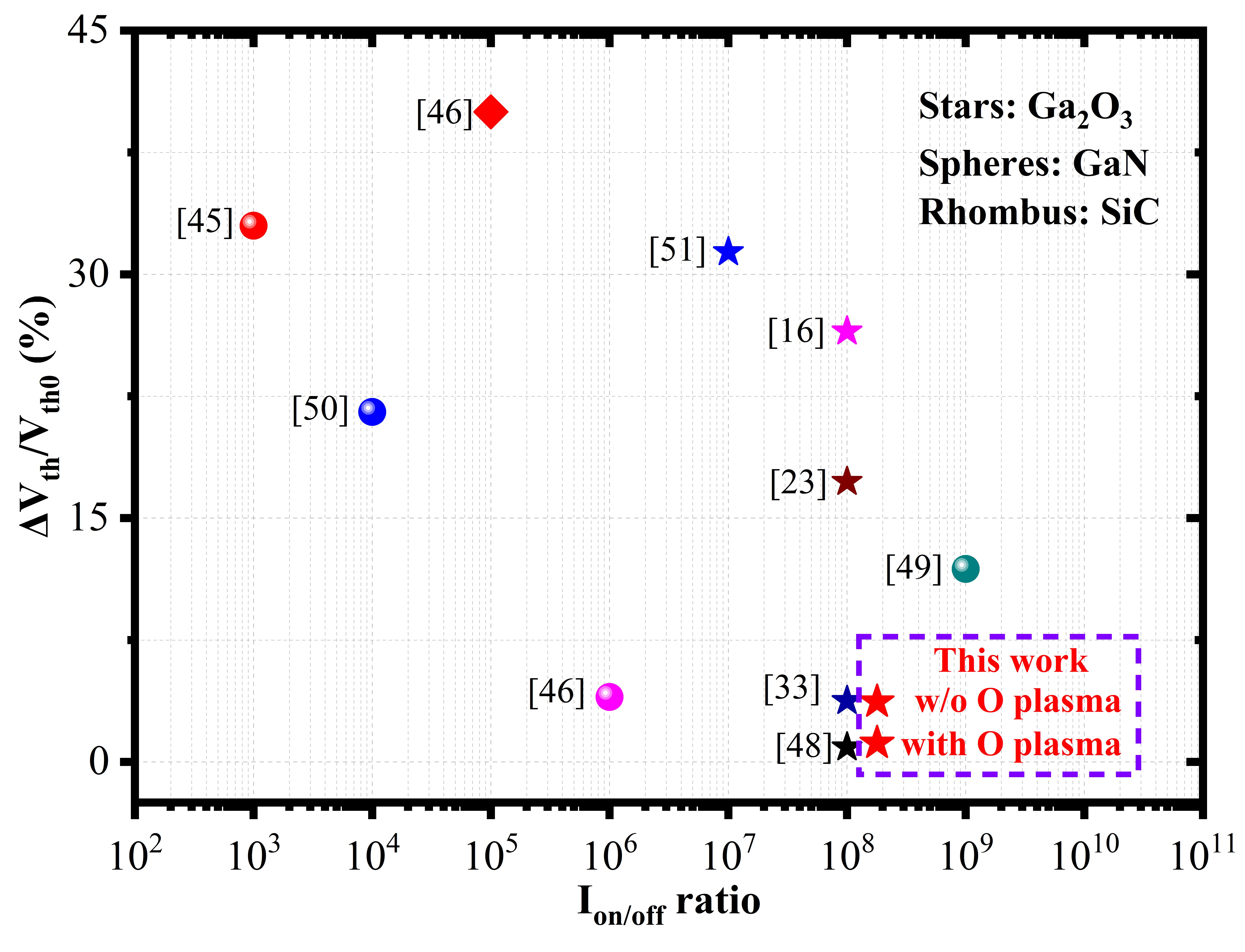 FIG.5 The ∆Vth shifting ratio versus the Ion/off ratio of reported Ga2O3 MOSFET (stars), GaN FET (spheres) and SiC FET (rhombus) and this work (red stars).
