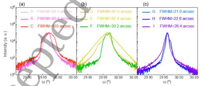Fig. 3. High-resolution X-ray diffraction rocking curves for the symmetric (020) reflection.