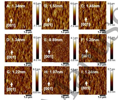 Fig. 2. Surface morphology and summary of structural properties. The 5 µm×5 µm AFM surface morphology scans for the nine designated points (A-I) across the 2-inch wafer all reveal a distinct step-flow growth mode, indicating an atomically smooth surface.
