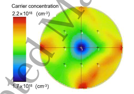 Fig. 4. Wafer-scale carrier concentration mapping. Spatial distribution map of the average carrier concentration across the 2-inch wafer, as determined by mercury-probe capacitance voltage (Hg-CV) measurements. The color scale indicates the concentration in cm⁻³. The map demonstrates good doping uniformity, with a slight center-to-edge variation.