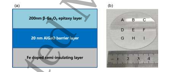 Fig. 1. (a) Schematic diagram of the MOCVD-grown epitaxial structure, consisting of a 200 nm Si-doped Ga₂O₃ channel layer and a 20 nm AlGaO back-barrier on an Fe-doped semi insulating (010) β-Ga₂O₃ substrate. (b) Optical image of the 2-inch wafer illustrating the 9 point mapping locations (A through I) used for systematic characterization.