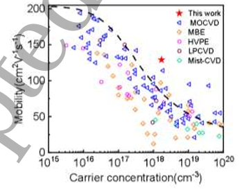 Fig. 6. Room-temperature Hall mobility benchmark. Electron mobility as a function of carrier concentration for the MOCVD-grown film on (010) β-Ga₂O₃ (red stars), compared with a compilation of literature data for β-Ga₂O₃ films grown on various orientations. The results from this work are positioned in the upper range of reported values, confirming the high electronic quality of the material.