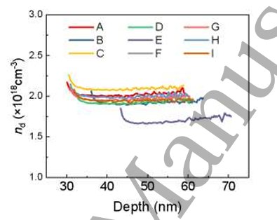 Fig. 5. Carrier concentration depth profiles. Carrier concentration (nd) as a function of depth from the surface, measured by Hg-CV at the nine locations across the wafer. The profiles are flat and stable throughout the bulk of the 200 nm Ga₂O₃ channel layer, indicating uniform silicon incorporation during MOCVD growth.