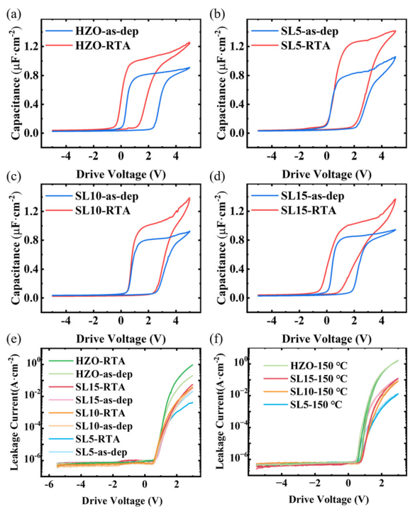 FIG. 4. (a)–(d) C–V characteristics of MFIS capacitors with HZO, SL5, SL10, and SL15 in as-fabricated and post-annealing states. (e) and (f) I–V characteristics of the corresponding MFIS capacitors at room temperature and 150 C.