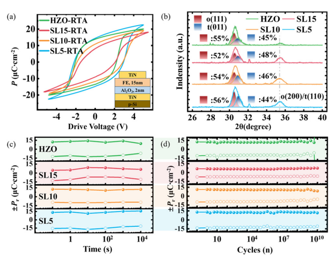 FIG. 3. (a) P–V hysteresis loops of the four capacitors (HZO, SL5, SL10, and SL15) measured after wake-up cycling (1 × 104 cycles at 5 V, 100 kHz). (b) GIXRD patterns of TiN/FE/Al2O3/β-Ga2O3 structures after annealing at 550 C. (c) Retention characteristics and (d) endurance characteristics of the four MFM capacitors.