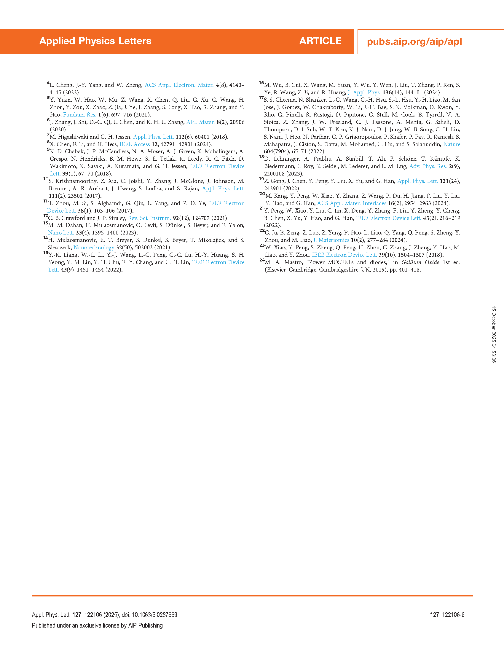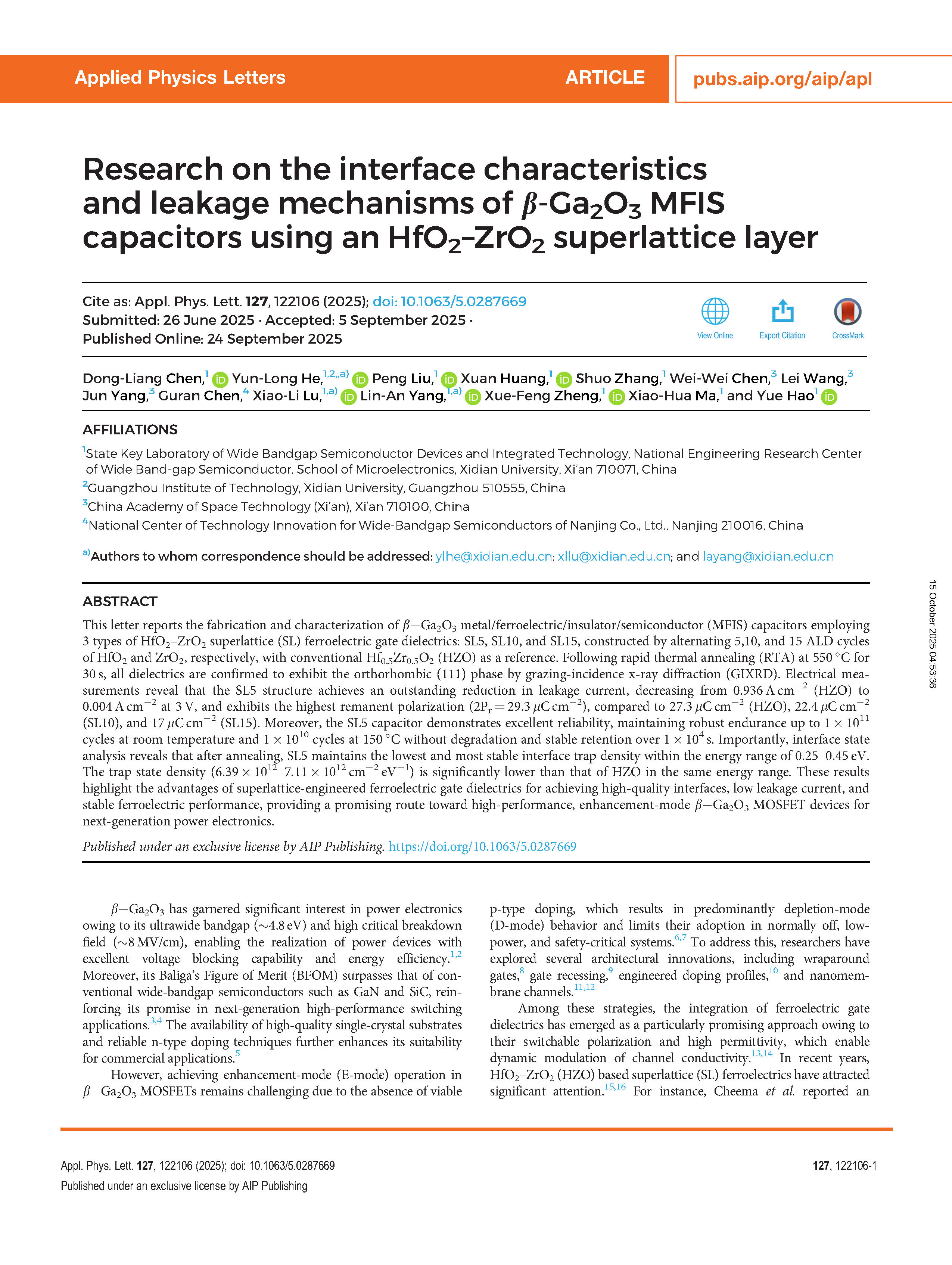Researchers from the Xidian University have published a dissertation titled "Research on the interface characteristics and leakage mechanisms of β-Ga2O3 MFIS capacitors using an HfO2–ZrO2 superlattice layer" in Applied Physics Letters.