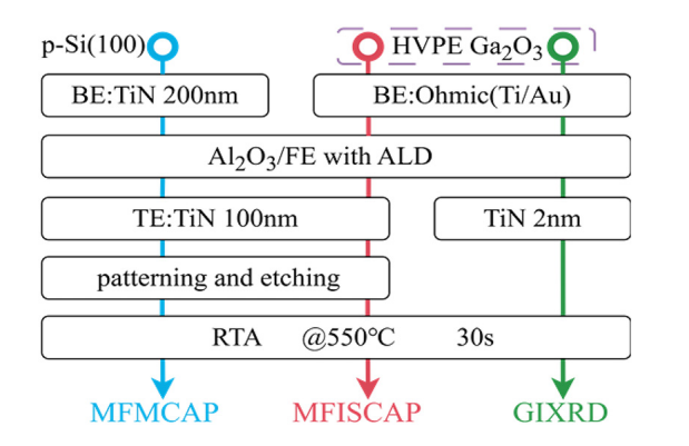 FIG. 1. Fabrication process flow for MFM capacitors, MFIS capacitors, and GIXRD samples.