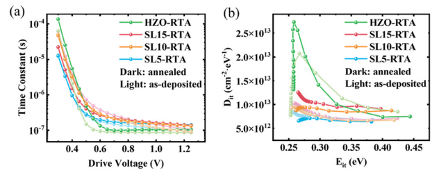FIG. 6. Interfacial characteristics of four MFIS capacitors before and after annealing. (a) Interface trap time constant (τit) as a function of gate voltage. (b) Interface trap density (Dit) as a function of trap energy below the conduction band edge.