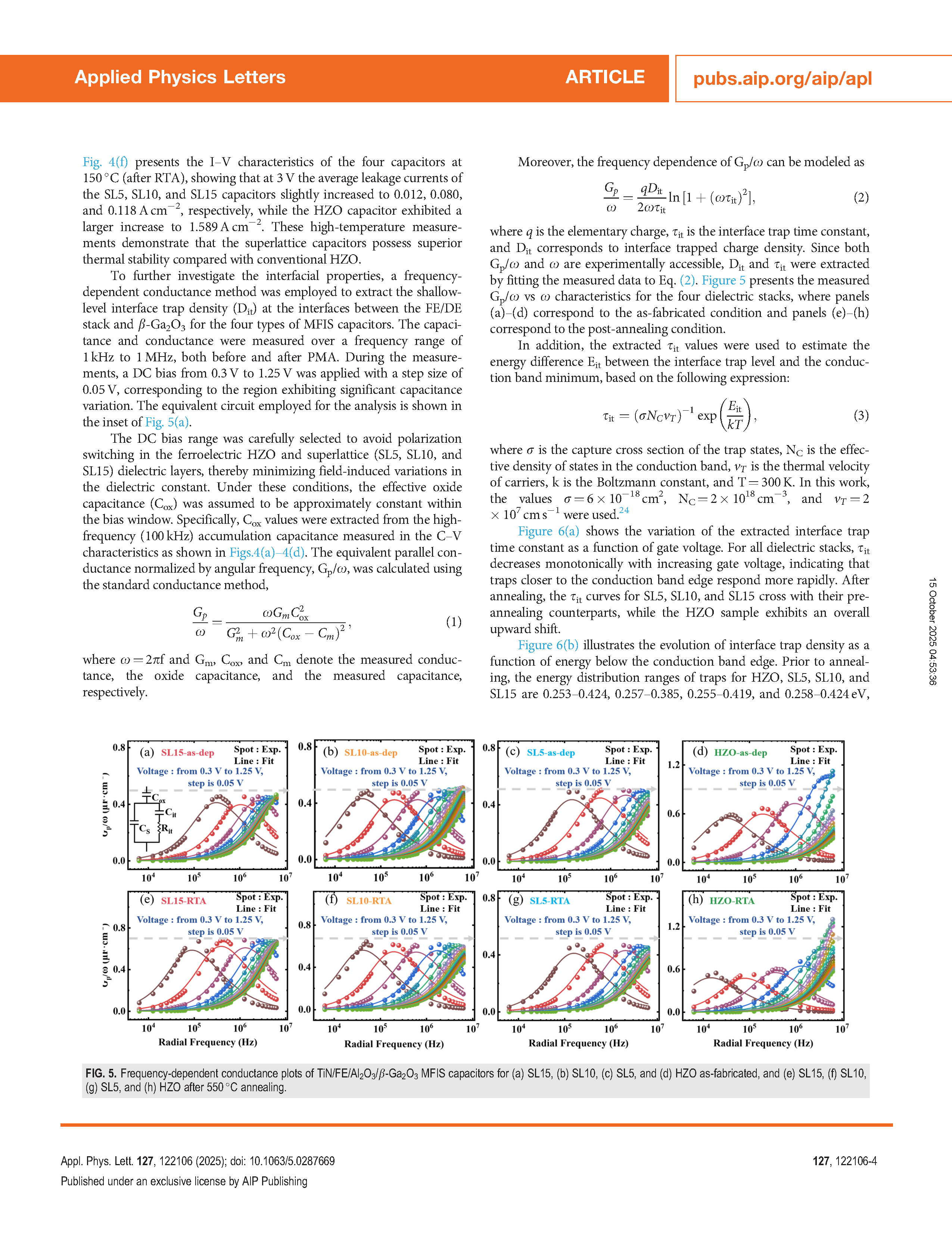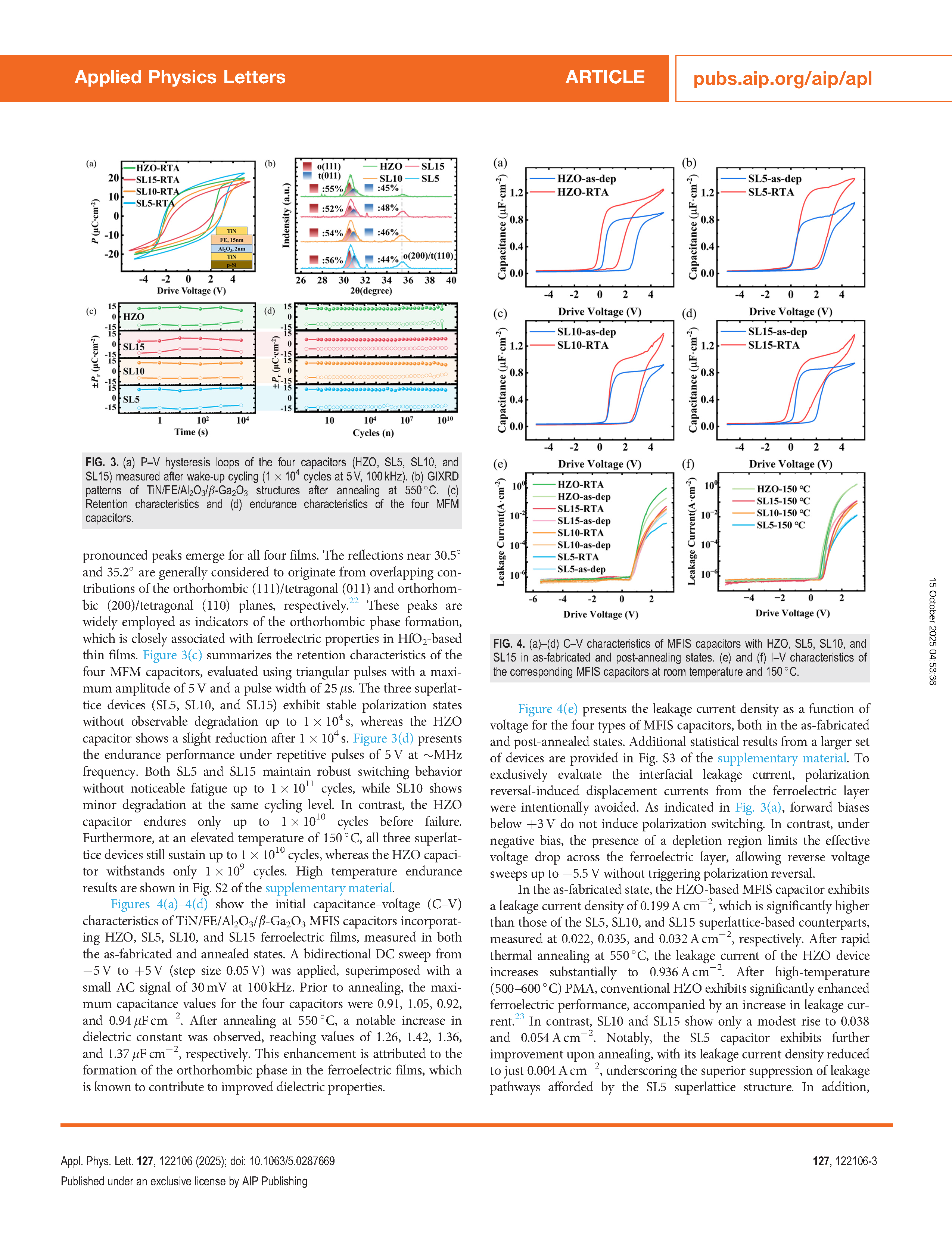 In summary, this work systematically elucidates the advantages of employing HZO SL ferroelectric gate dielectrics in β-Ga2O3 MFIS capacitors, benchmarked against conventional HZO and the thicker-period SL10 and SL15 counterparts. After PMA at 550 C, the SL5 device achieves a pronounced reduction in leakage current (from 0.936 A cm-2 for HZO to 0.004 A cm-2 at 3 V) while maintaining the largest remanent polarization (2Pr = 29.3 μC cm-2, vs 27.3, 22.4, and 17 μC cm-2 for HZO, SL10, and SL15, respectively). Moreover, SL5 exhibits the lowest and most stable interface trap density (Dit reduced from 6.78 × 1012–8.43 × 1012 to 6.39 × 1012–7.11 × 1012 cm-2 eV-1 after annealing), as well as outstanding reliability, sustaining >1 × 1011 switching cycles at room temperature and >1 × 1010 cycles at 150 °C, together with stable polarization retention over 1 × 104 s. These results highlight that superlattice engineering—particularly with the SL5 architecture—enables the simultaneous realization of high polarization, suppressed leakage, reduced interface traps, and excellent endurance and retention, thereby establishing a promising pathway toward reliable, high-performance, normally off β-Ga2O3 power electronics.